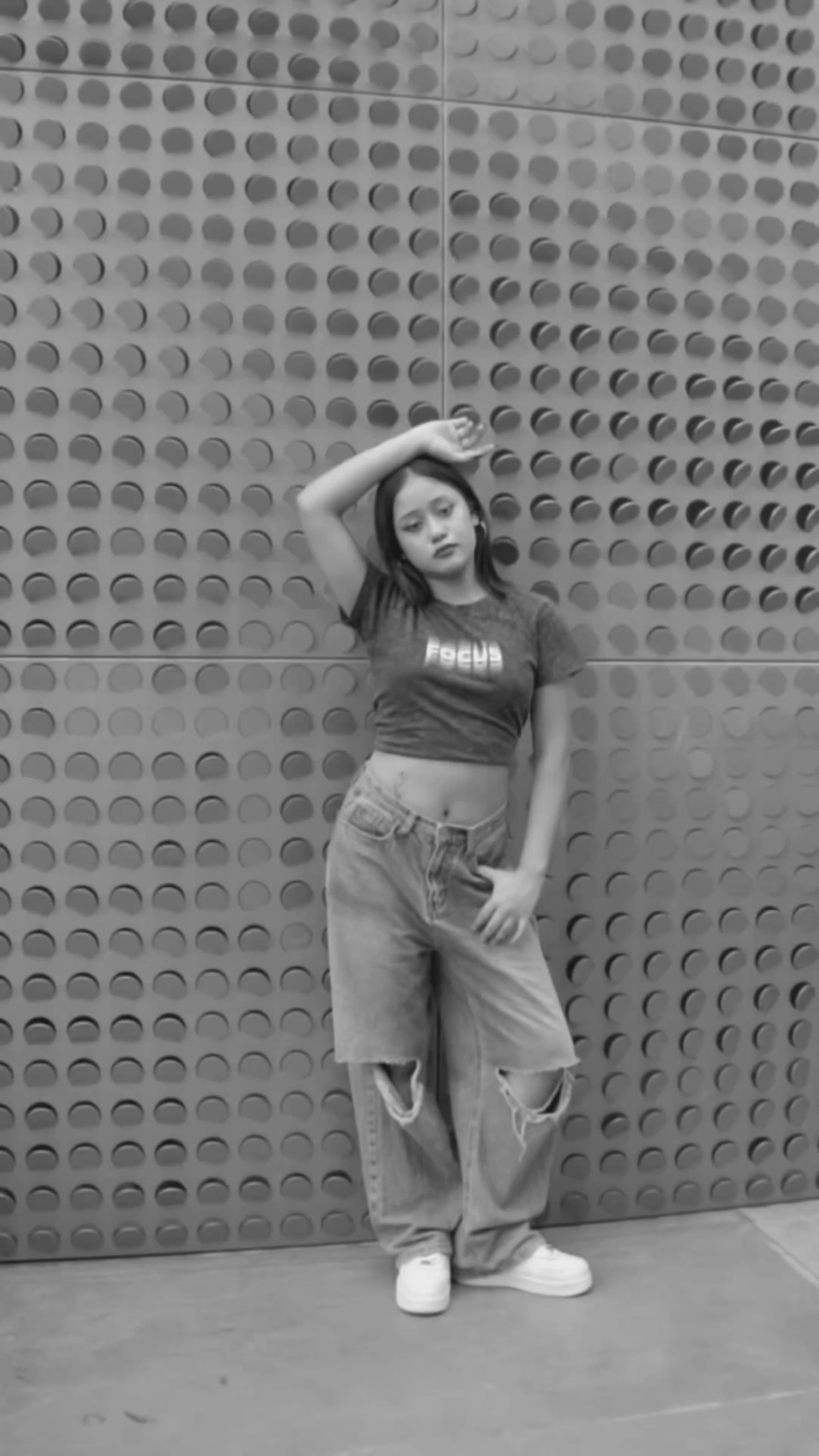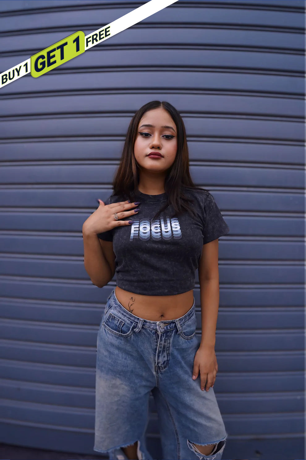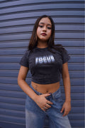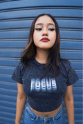 The Illusion Grey baby tee plays with minds and mirrors – featuring a hypnotic "FOCUS" illusion print in high-definition and puff mix.